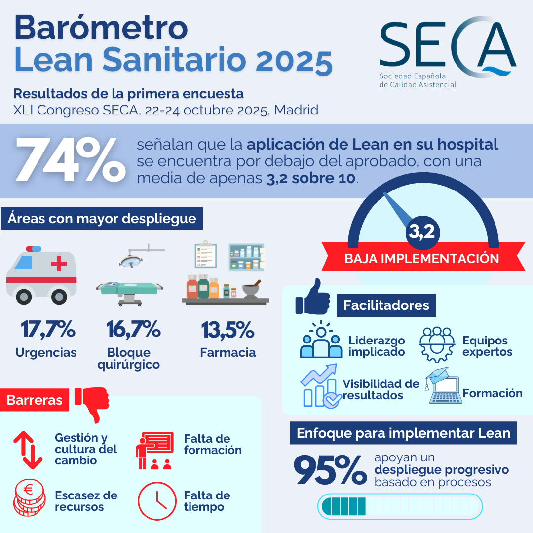 La guía se presentó en el último congreso nacional de la SECA, donde también se realizó la encuesta del primer Barómetro Lean Sanitario, un estudio que ha permitido evaluar el nivel de implantación de Lean en hospitales españoles. Según los resultados de este barómetro, la mayoría de los centros aún muestran bajos niveles de implementación: el 74% de los participantes situó su despliegue por debajo del aprobado, con una media de apenas 3,2 sobre 10.